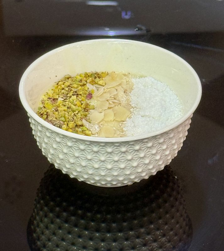 lapte integral de vaca, zahar, amidon din porumb, Decor: cirese confiate, fulgi de migdale, nuca de cocos