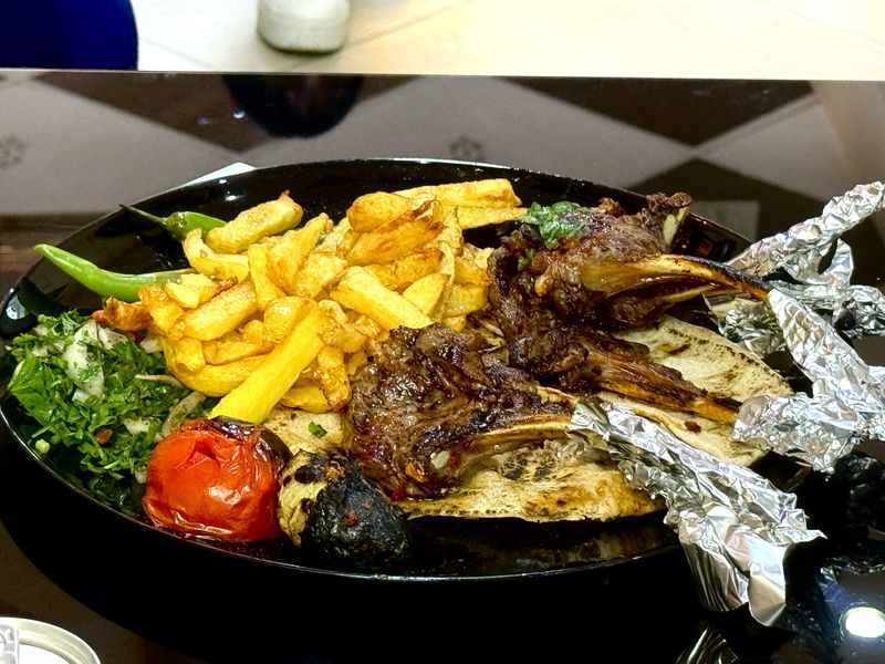 COTLET DE OAIE, GARNITURA GRILL (rosie coapta, ceapa coapta, patrunjel, ardei kapia, lipie mare la gratar-1buc), CARTOFI PRAJITI, PASTA DE ARDEI, PIPER, SARE